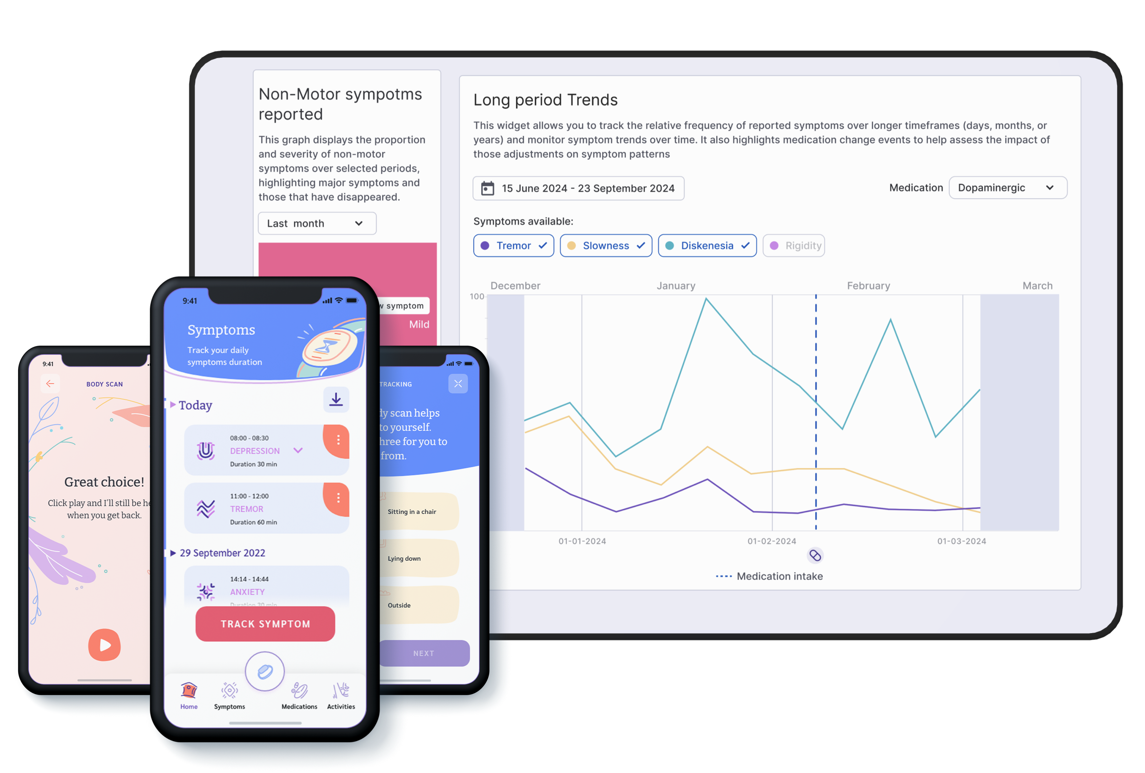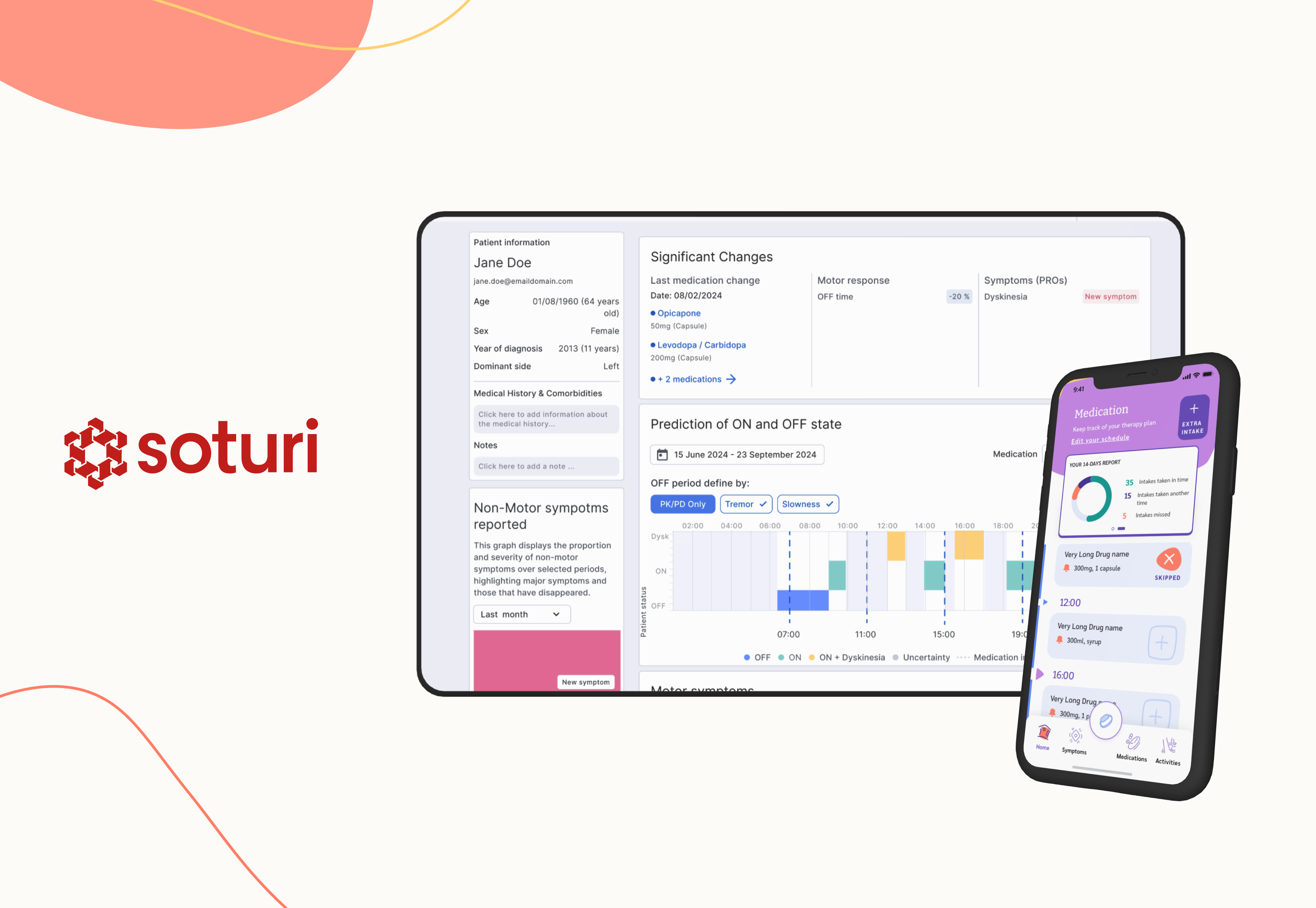 Soturi is a digital solution for personalized Parkinson's care. It combines a mobile app, wearable sensors, and digital biomarkers to track symptoms and medication adherence in real time. A clinical dashboard gives healthcare professionals continuous access to patient data, while a decision support system recommends individualized dose adjustments using pharmacological models.